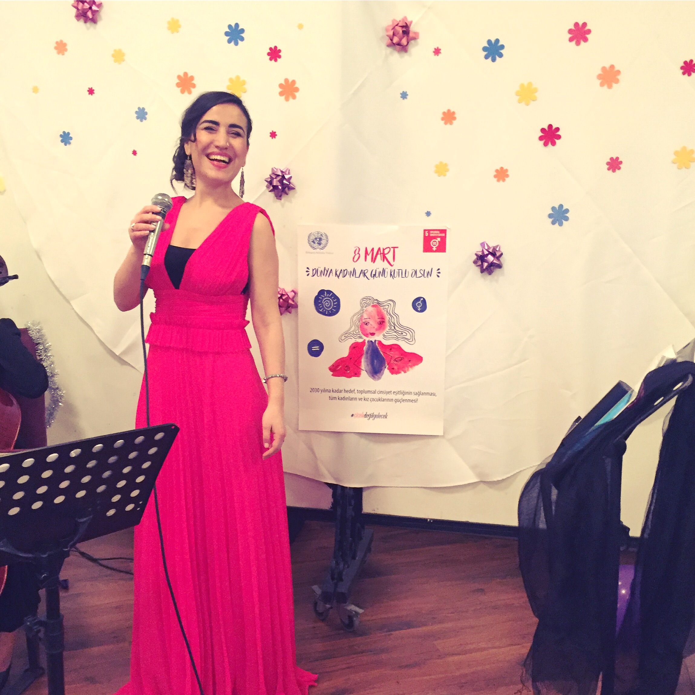 ODTÜ Vişnelik tesislerinde 8 mart haftası etkinliklerinde şarkı söylemekten keyif aldım. HÜKSAM’ın davetlisi olarak katıldığım #çiçekdeğilgelecek projesi etkinliğinde Suriyeli kadınlar Aysun’ca şarkılarla eğlendi.. Benim için hem müzik ve sahne hem de gönülden destek verdiğim kadınlarla eğlenmek muhteşemdi.. Kadınlar yaşasın, kadınlar güçlensin.. Orkestrada bulunan erkek arkadaşlarım paravanın arkasından çaldılar enstrümanlarını. Kadınlar rahat hareket edebilsinler diye böyle bir çözüm bulduk.. Benim için çok özel bir deneyimdi..